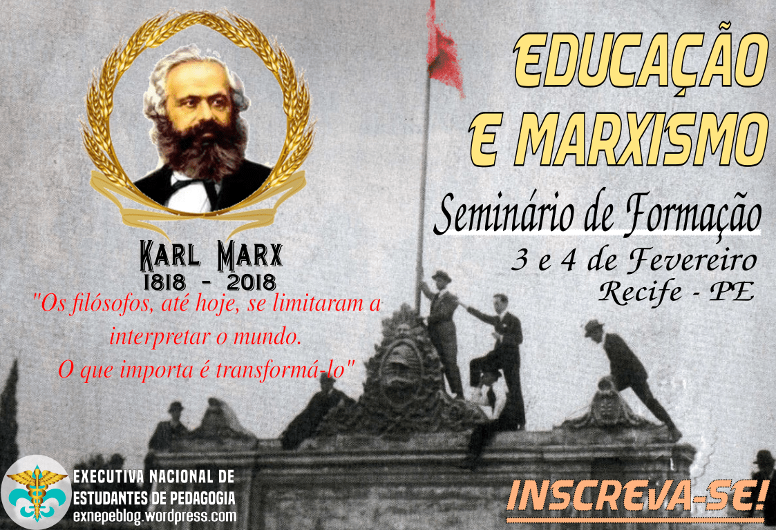 O Seminário de Formação – Educação e Marxismo será a primeira atividade nacional da Executiva Nacional de Estudantes de Pedagogia – ExNEPe e será dedicado à celebração da passagem dos 200 anos de nascimento do grande fundador do Socialismo Científico Karl Marx, o maior cientista de toda a Humanidade e dos 100 anos da Revolta de Córdoba, luta universitária histórica que alçou às alturas o desenvolvimento da Universidade Democrática na América Latina, mobilizando estudantes em diversos países e arrebatando as conquistas douradas de Cogoverno Estudantil e Autonomia Universitária real.