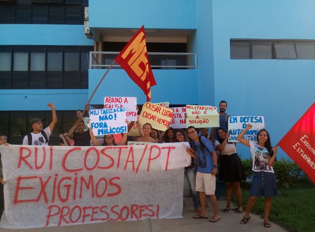 A manifestação também serviu para denunciar o avanço da militarização das escolas estaduais na Bahia, projeto de cunho fascista que ataca os direitos de livrve expressão e organização dos professores e estudantes, colocando a formação de nossos jovens nas mãos das reacionárias e genocidas Forças Armadas e Polícias Militares.