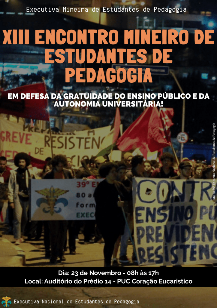 A Executiva Mineira de Estudantes de Pedagogia (ExMEPe) convida todas e todos os estudantes de pedagogia e entidades, estudantes de licenciatura e pós-graduação, professores e educadores de Minas Gerais para participarem do seu 13º Encontro Mineiro de Estudantes de Pedagogia (EMEPe), que ocorrerá no dia 23 de novembro, a partir das 08 horas do dia, na Pontifícia Universidade Católica de Minas Gerais, no bairro Coração Eucarístico. O Encontro emitirá certificados de 8 horas formativas a todos que comparecerem.