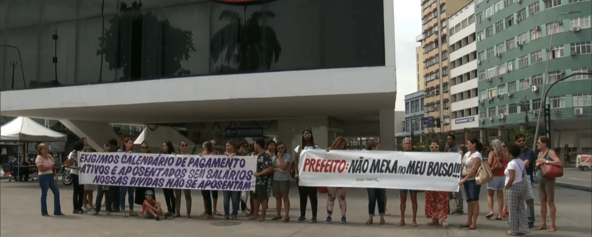 Centenas de trabalhadores da educação ativos e inativos de Duque de Caxias, na Baixada Fluminense, estão sem receber salário desde novembro do ano passado. O atraso dos salários é o que motivou protesto em frente a prefeitura do município.