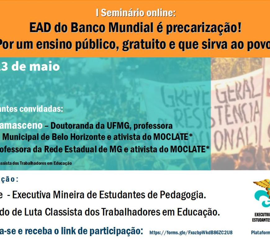 No último dia 23 de maio, a Executiva Mineira dos Estudantes de Pedagogia realizou, junto ao Comando de Luta Classista dos Trabalhadores da Educação, um vitorioso I Seminário Online, com o título “EAD do Banco Mundial é precarização! Por um ensino público, gratuito e que sirva ao povo!”. Transmitido pela plataforma Google Meet, contou com 60 inscrições e com alta participação até o final do … Continuar lendo Vitorioso I Seminário online da ExMEPe e Comando de luta Classista dos Trabalhadores em Educação!