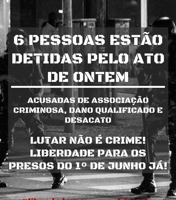 Não aceitaremos calados que os presos do 1° de Junho, que mesmo sob custódia, sejam submetidos a negligência dos direitos mais básicos, ficando sem acesso a água e uso do banheiro por longo período de tempo. Não aceitaremos o abuso do poder dos policiais que agrediram fisicamente e moralmente os jovens que estavam exercendo seu livre direito de manifestar-se. Não aceitaremos que tirem de nós nosso direito de nos organizarmos e lutarmos. Por isso, exigimos liberdade imediata aos 6 presos políticos!