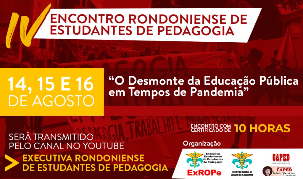 O EROEPe é um encontro de caráter acadêmico, científico, político e cultural organizado por estudantes e que visa debater as políticas educacionais que afetam a universidade e a formação docente dentro do contexto político brasileiro atual, bem como fortalecer a organização e as entidades estudantis de Pedagogia em nível local, estadual e nacional. Neste IV EROEPe discutiremos especialmente o papel de Pedagogos e estudantes na defesa de um ensino que seja Público, Democrático, Científico e que atenda às necessidades do Povo Brasileiro, diante de uma conjuntura de desmonte da educação pública e retirada de direitos sociais em tempos de pandemia.