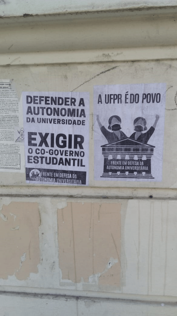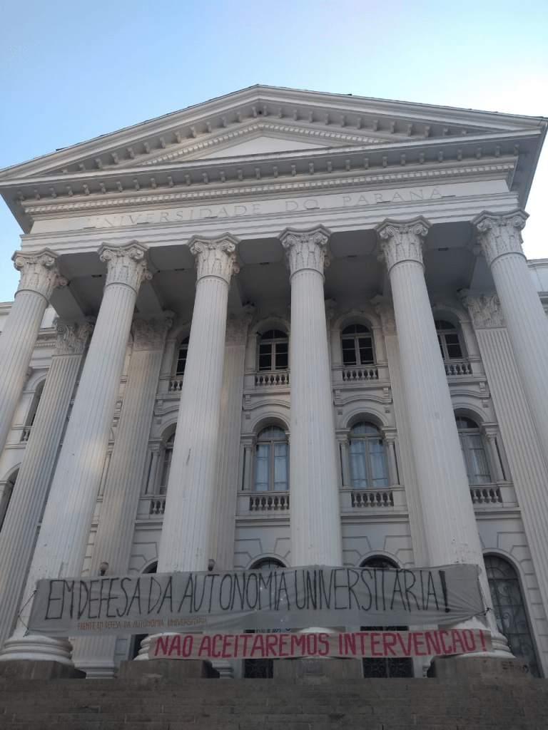 A UFPR passa por um período conturbado no que diz respeito à sua autonomia, que há muito tempo não passa de farsa. Os constantes cortes orçamentários, a perseguição à estudantes combativos e agora a ameaça de intervenção direta do MEC/ governo federal tornam a situação insustentável. Em meio à consulta pública para nomeação de reitor da instituição se apresentaram duas chapas, que embora diferentes na aparência conservam a mesma essência antidemocrática de sempre. O atual reitor Ricardo Marcelo, que carrega em seu histórico a marca de perseguir e processar estudantes venceu de lavada contra Horácio Tertuliano e sua chapa obscurantista, que prega contra a chamada “doutrinação comunista” nas universidades etc. Uma vez derrotado, tendo menos de 15% dos votos, Horácio passou à sua estratégia, nem um pouco original a essa altura, de questionar o processo eleitoral, visando ser nomeado interventor por Bolsonaro.