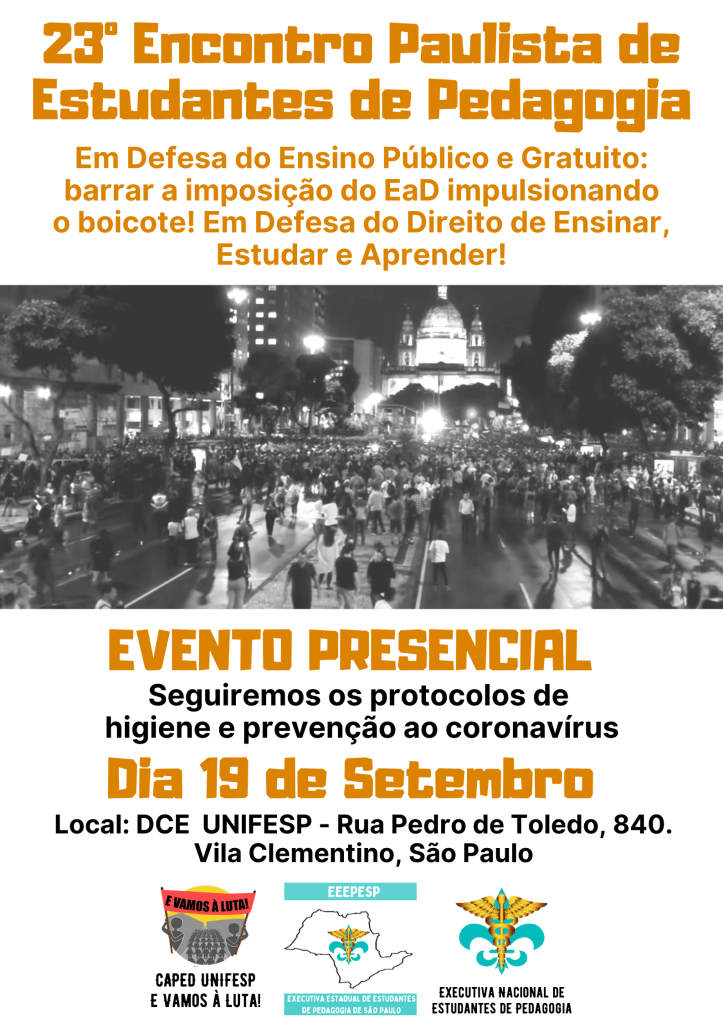 No próximo dia 19 de Setembro, será realizado o 23º Encontro Paulista de Estudantes de Pedagogia. O Evento acontecerá no prédio do DCE da Unifesp, localizado na rua Pedro de Toledo, 840, Vila Clementino- SP