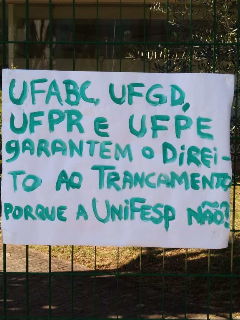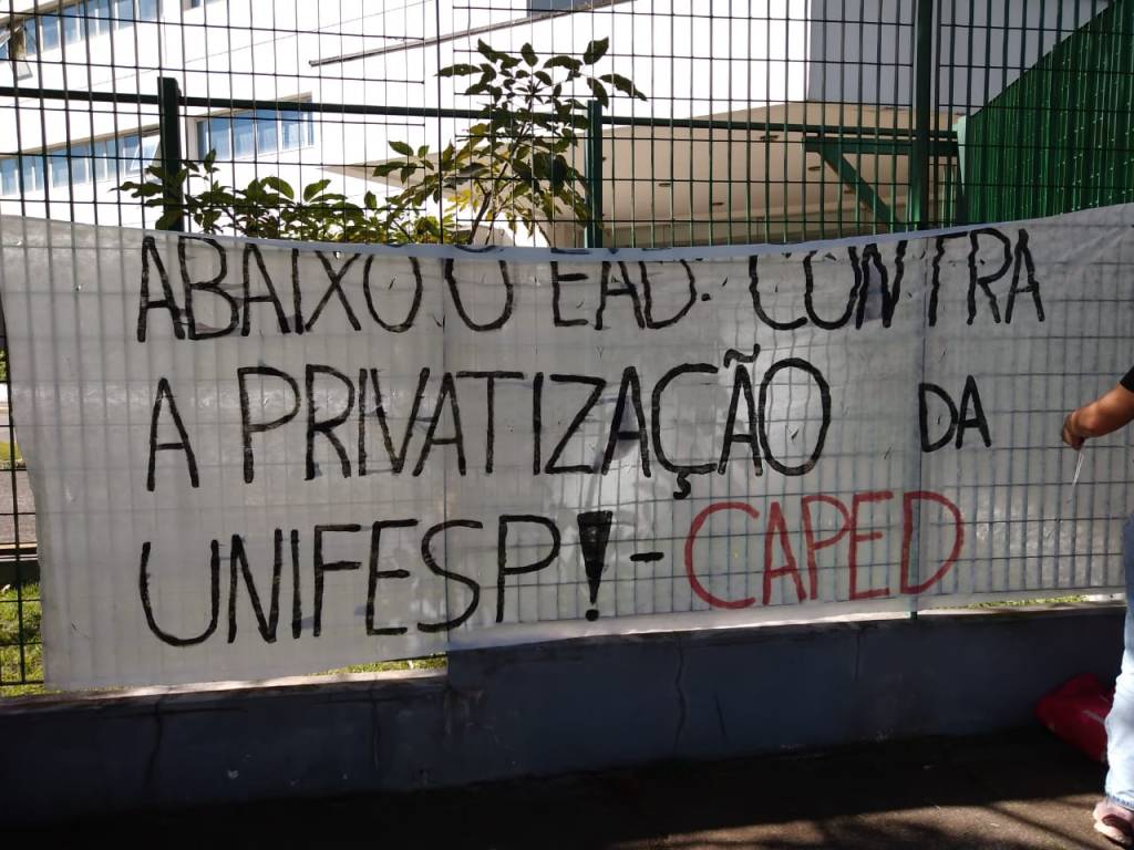 No último dia 27, estudantes da UNIFESP, campus Guarulhos, realizaram um ato presencial em frente ao edifício da reitoria, zona sul da região metropolitana de São Paulo, reivindicando o direito dos estudantes de não cursarem as ADEs (ensino remoto) e o direito ao trancamento do semestre sem perda de bolsas e auxílios. Foram confeccionados cartazes e faixas denunciando o processo de privatização criado através da EaD, como a parceria com empresas para compra de chips e empréstimos de computadores, além do uso generalizado de plataformas de monopólios como o Google, bem como a precarização do ensino. Todos os participantes seguiram as recomendações para prevenção ao coronavírus, com o uso de máscaras, álcool em gel e distanciamento.