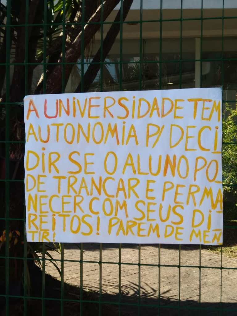 A afirmação não se verifica na realidade, pois outras universidades federais asseguram parcial ou totalmente esse direito aos estudantes, como a UFPR, UFPE, UFGD e a UFABC. Essa última, vizinha da Unifesp, publicou um boletim de serviço em 15 de julho desse ano, esse documento traz o regulamento das atividades acadêmicas e no 7 art, item c) “O cancelamento de matrícula em disciplina e o trancamento do quadrimestre não impactam sobre a vigência de bolsas, processos seletivos futuros ou para o tempo de integralização do curso.” Portanto, está claro que não há impedimento jurídico, nada impede a universidade de mudar os regulamentos – que já foram todos adaptados para garantir a implantação da EaD imposta pelo MEC – e permitir que os estudantes bolsistas tenham o direito ao trancamento do semestre sem sofrerem a chantagem de serem obrigados a cursar o EaD, caso contrário perderiam seu salário.