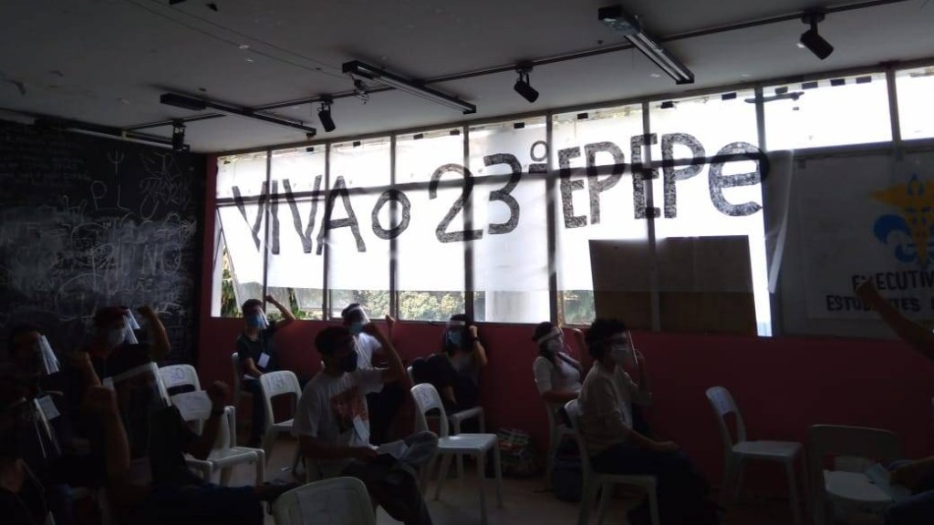 Em seguida, votamos o Plano de Lutas da Executiva Paulista na Plenária Final, baseado nas propostas feitas durante dos Grupos de Discussão, que deverá ser aplicado nas universidades do estado. O plano é voltado para a luta pelo boicote à implementação do ensino remoto e pela mobilização da delegação de São Paulo para a ida ao 40º Encontro Nacional, em Curitiba/PR.