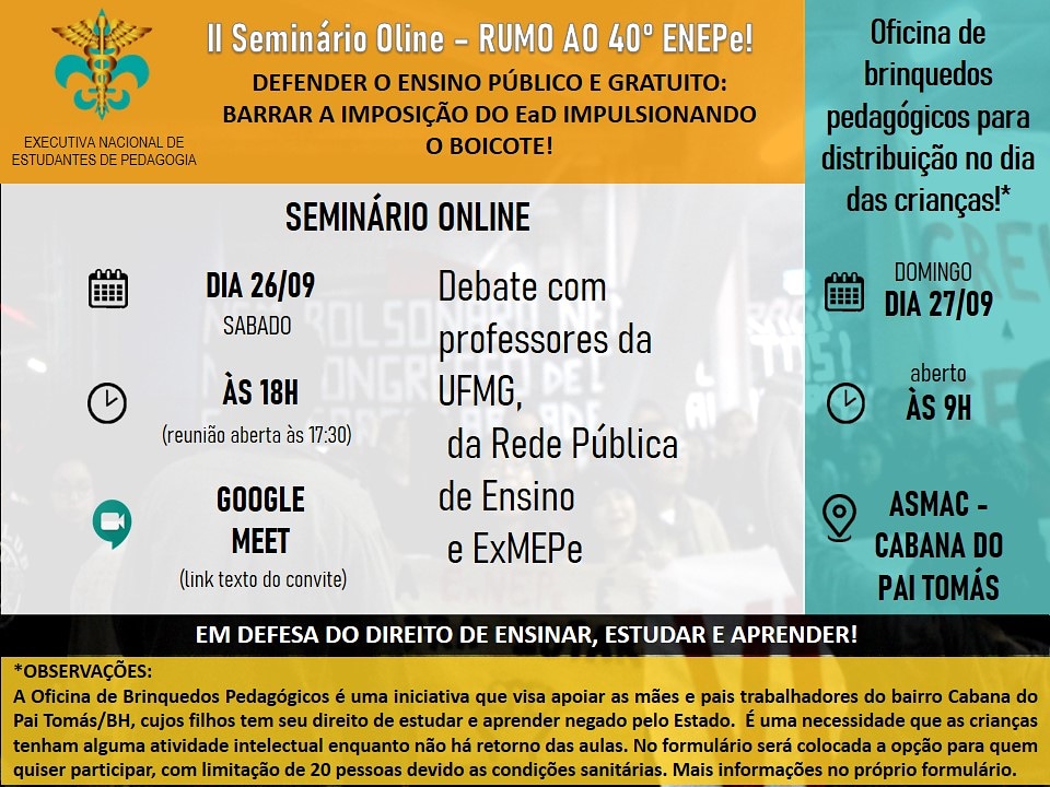 No próximo sábado, 26/09, a Executiva Mineira de Estudantes de Pedagogia realizará seu II Seminário Online, com tema “DEFENDER O ENSINO PÚBLICO E GRATUITO: BARRAR A IMPLEMENTAÇÃO DO EaD IMPULSIONANDO O BOICOTE”! Será feito um debate sobre o que representa o EaD/Ensino Remoto para as massas populares durante a pandemia: é a privatização do ensino público e negação do direito de ensinar, estudar e aprender do povo. E para barrar essa medida anti-povo, chamamos a todos os estudantes de pedagogia e demais interessados para discutir e impulsionar o boicote como tática da luta estudantil!