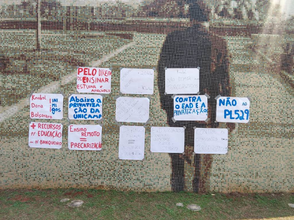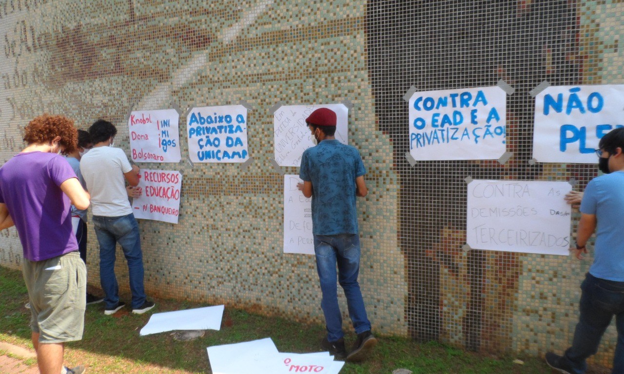 No dia 14/09, os estudantes da Frente Contra a EaD da Unicamp realizaram ato presencial, em frente a Reitoria da Unicamp. Em seus cartazes e faixas, os estudantes reivindicavam o direito de ensinar, estudar e aprender; contra o PL529 e a precarização e privatização da universidade pública.