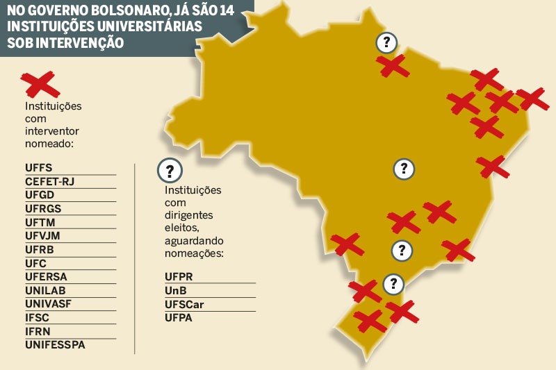 Questão nacional – A interferência do governo federal na autonomia das instituições de ensino federais vem se tornando cada vez mais frequente. A prática de não seguir a escolha da comunidade acadêmica para reitores, por exemplo, já se repetiu em outras nove universidades federais brasileiras.