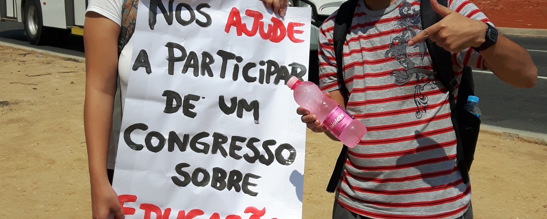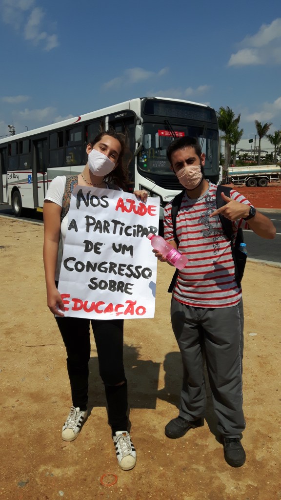 Segurando um cartaz que dizia “Nos ajude a participar de um congresso sobre educação”, vendiam a água por 2 reais e pediam o apoio do povo.