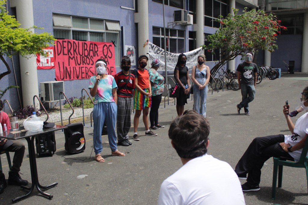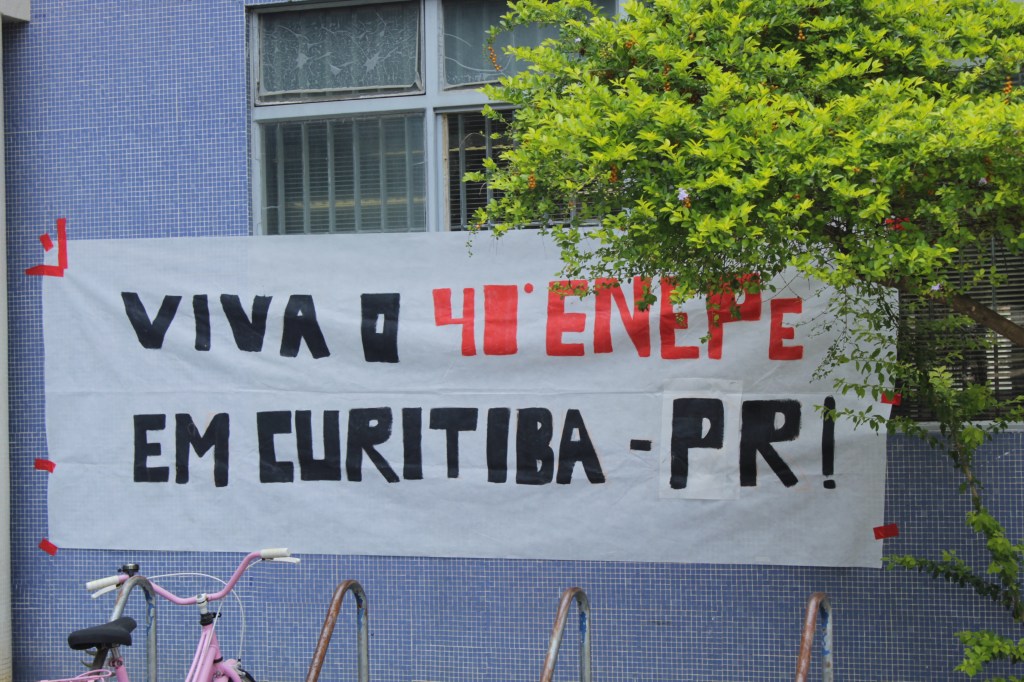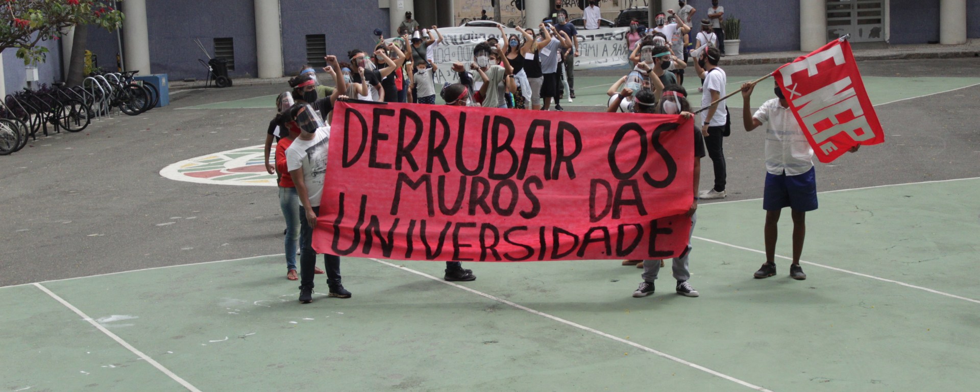 Ocupamos o pátio do campus respeitando distanciamento social, usando máscara e face-shield, puxando palavras de ordem e colando faixas por todas as paredes com as consignas: “DERRUBAR OS MUROS DA UNIVERSIDADE!”, “EM DEFESA DO ENSINO PÚBLICO E GRATUITO: BARRAR A IMPOSIÇÃO DA EaD IMPULSIONANDO O BOICOTE! EM DEFESA DO DIREITO DE ESTUDAR, ENSINAR E APRENDER”, “VIVA O 40º ENEPe EM CURITIBA-PR!”, “ENFRENTAR OS ATAQUES DO GOVERNO COM ORGANIZAÇÃO E LUTA!”, “EM SOLIDARIEDADE AOS 160 MIL MORTOS POR COVID-19”.