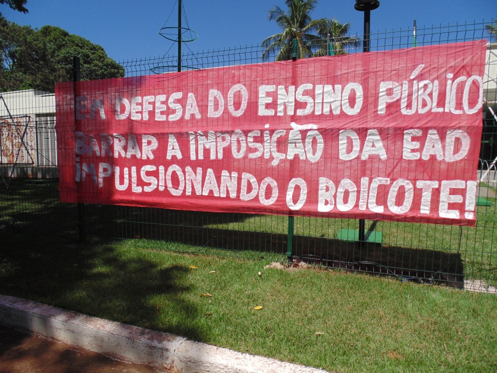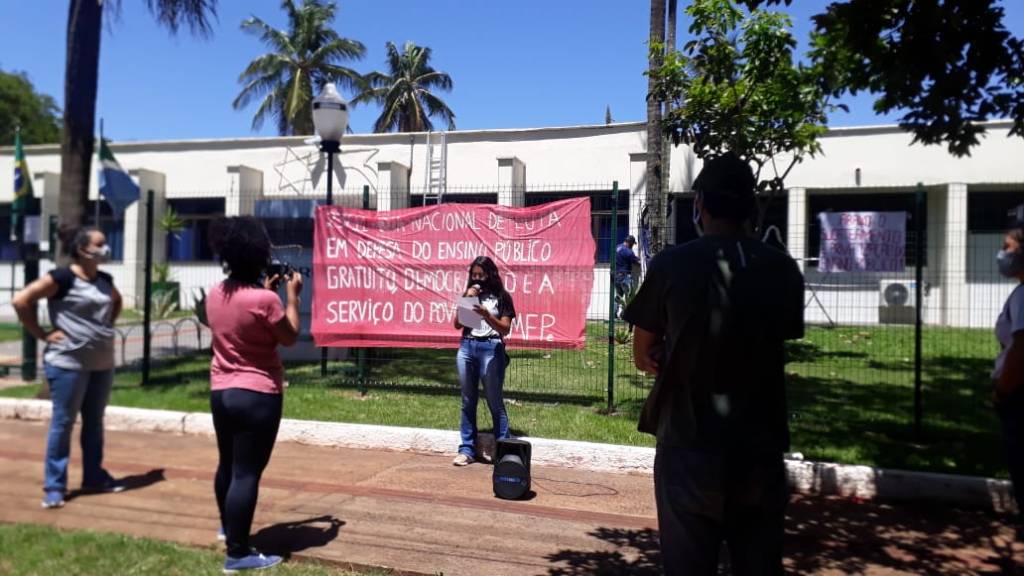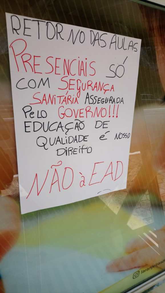 Entoando palavras de ordem como “interventora, preste atenção, aqui tem estudante que defende a educação!”, “ensino remoto é privatização, serve aos monopólios, sucateia a educação!” e “pelo direito de estudar e aprender, boicotar e barrar a Ead”. A fachada da Reitoria foi tomada por faixas e cartazes contra a Ead, pelo boicote e em defesa da Educação.