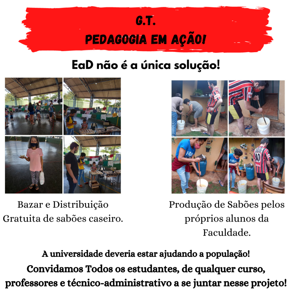O G.T. Pedagogia em Ação!, convoca todos os estudantes, professores e técnico-administrativos a se juntarem na luta para derrubar os muros da universidade, ajudando a população nesta crise sanitária. Colocando a Universidade a serviço do povo!