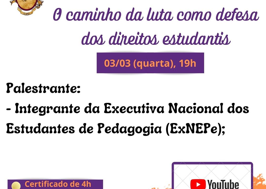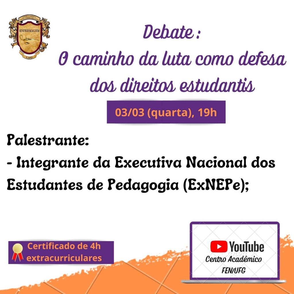 Quarta feira (03/03), 19h via canal do YouTube (Centro Academico FEN UFG)