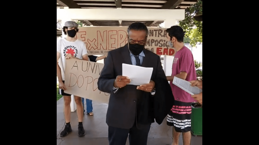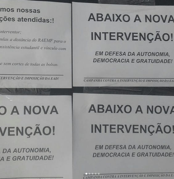 O ato começou em frente a reitoria com confecção de cartazes e a leitura de uma carta a ser entregue ao novo interventor, colocando o posicionamento dos estudantes sobre a nova intervenção e a imposição da ead. Onde também apresentam suas exigências, na qual reivindicam: 1 – a renúncia do novo interventor; 2 – a suspensão da obrigatoriedade de cursar as aulas ead, mantendo as bolsas e o vínculo com a universidade; 3 – manutenção integral de todas as bolsas.