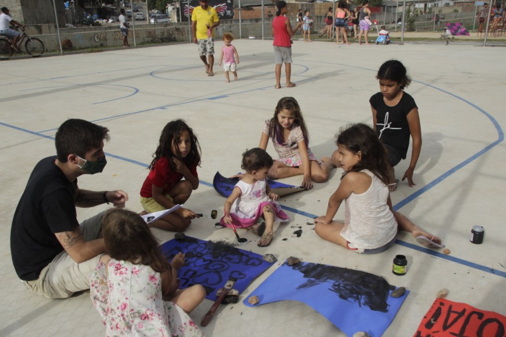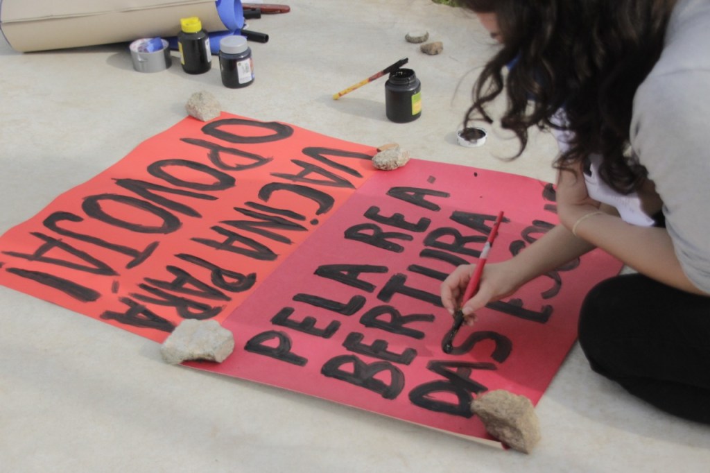 Uma vez no bairro, estudantes e moradores que participam do Comitê Sanitário da região se separaram em grupos para conversar com a população, distribuir panfletos, colar lambes e fazer cartazes sobre a data. Pelas ruas e casas o sentimento do povo era um só: revolta! Seja pelas condições de vida deploráveis, pelas mortes de conhecidos em decorrência da pandemia e do abandono do Estado, pela violência rampante e cotidiana, e de forma muito demarcada pela situação dos jovens, que sem escola se encontram abandonados à própria sorte. Lhes é negado o direito a estudar e aprender, a maioria das crianças só tem acesso ao “conteúdo” por meio da televisão, e os pais relatam constantemente: “meu filho não está aprendendo nada”, “só empurraram ele para o próximo ano”, “querem mais é que a gente não tenha estudo para não irmos contra eles”.