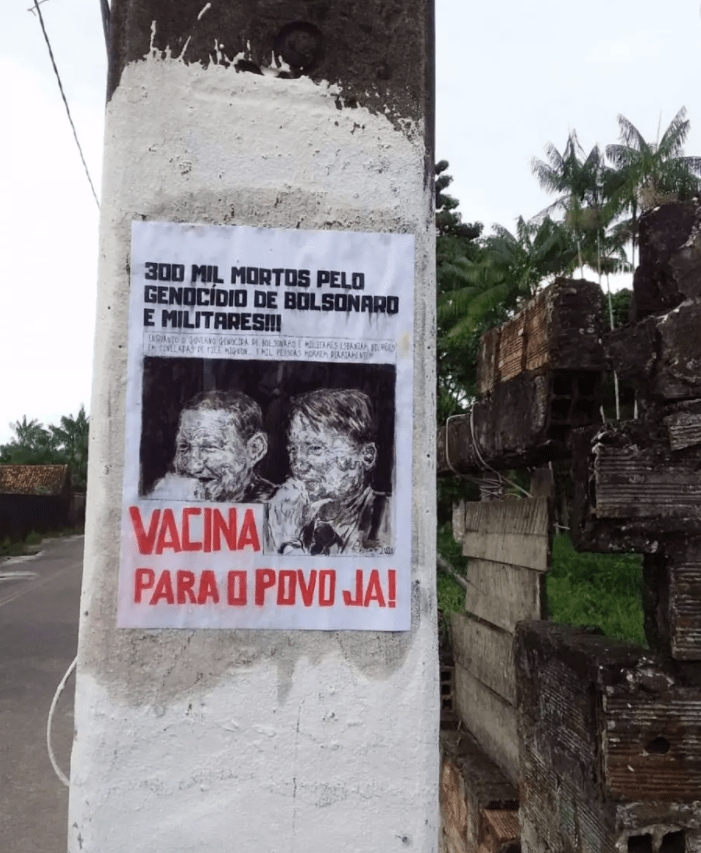 Os moradores e ativistas no último mês também promoveram uma colagem de cartazes no mesmo bairro reinvindicando vacina para o povo, além de denunciar os crimes de morte cometido pelo governo genocida de Bolsonaro/Militares.
