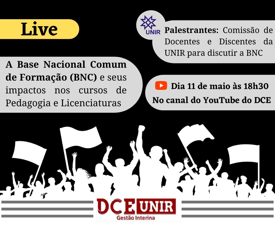 Para isso convidamos, para sanar todas as dúvidas e preocupações que possam surgir, a Comissão de Docentes e Discentes da UNIR para discutir a BNC. A live será transmitida no canal do YouTube do DCE no dia 11/05 (terça-feira) às 18:30 horário de Rondônia, e 19h30 no horário de Brasília.