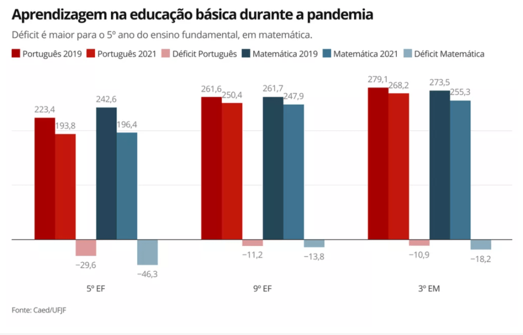 Para recuperar os 46 pontos de aprendizagem perdidos em matemática na pandemia, seriam necessários 11 anos de investimentos em educação básica. Isso porque, historicamente, os índices do Sistema de Avaliação da Educação Básica (Saeb), usados como “régua” de referência para a análise da UFJF, evoluem cerca de 4 pontos a cada ano.