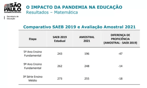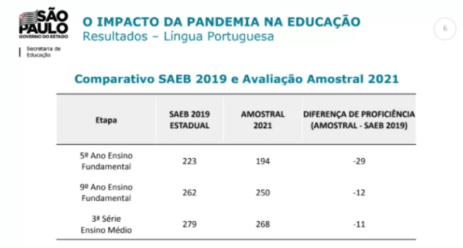 A avaliação amostral foi realizada no início de 2021 com 7 mil alunos e foi construída para ser comparável ao Saeb (Sistema de Avaliação da Educação Básica), aplicado pelo governo federal. O objetivo era avaliar os impactos das mudanças, como fechamento de escolas e aulas à distância em relação aos resultados alcançados em 2019, quando foi aplicada a última prova do Saeb.