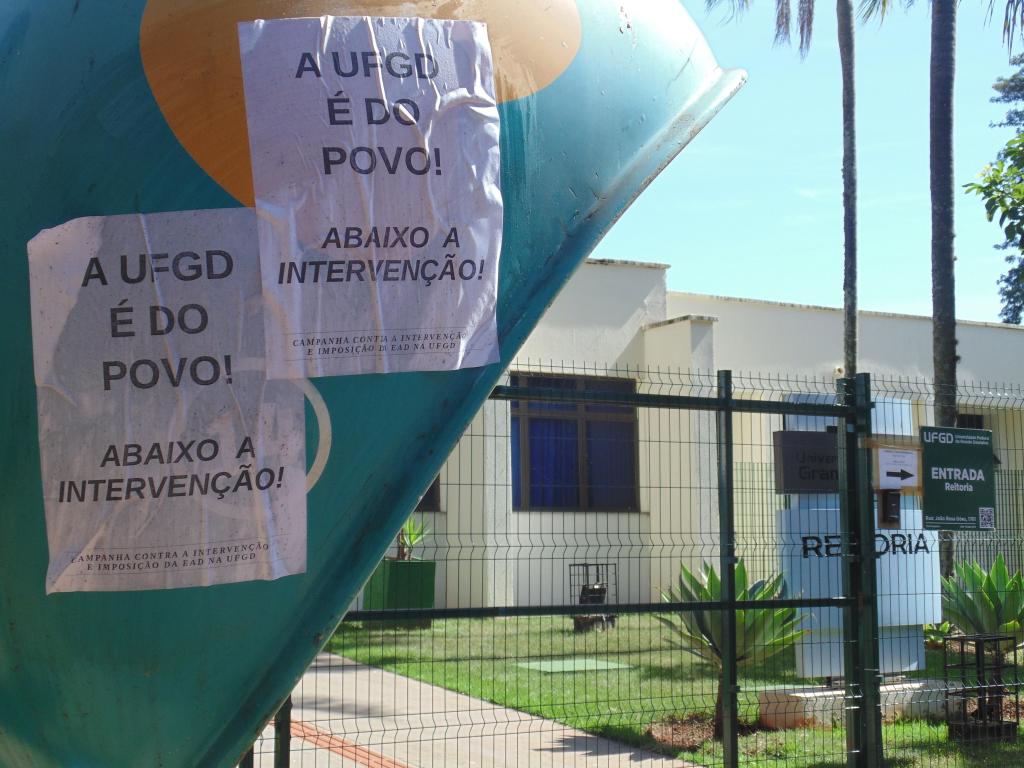 O ATO realizado no dia 19/05, feito na frente da reitoria da UFGD com os cartazes, colagem de lambes em volta da reitoria e faixas contra os cortes de verbas, contra a imposição da EaD, contra a intervenção e em solidariedade ao Acampamento Manoel Ribeiro. Um ATO vitorioso, pois a consiga: “Pelo direito de estudar, ensinar e aprender” foi firmemente colocada para todos os que participaram do ATO. O Interventor se negou a falar com os estudantes, no entanto, parou para ler a faixa dos estudantes: “A quem serve a intervenção? Lute pelo co-governo estudantil!”.