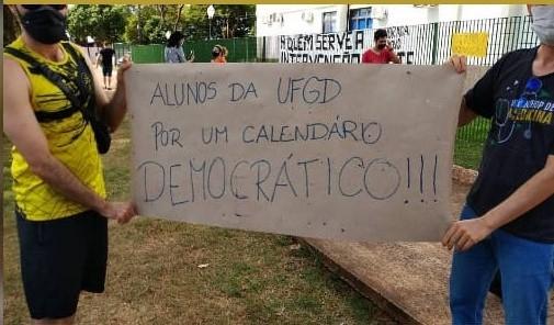 Também no dia 21/05 os estudantes da UFGD se organizaram em outro ATO na frente da reitoria para denunciar o calendário interventor que passou por cima da autonomia e democracia universitária novamente impondo um calendário que mantém a EaD como única forma de estudo, prejudica os estudantes que estão na universidade a estudarem e ingressa os calouros a estudarem na modalidade a distância, dando continuidade ao plano de sucatear, precarizar para privatizar as universidades públicas também agora com os cortes de mais de 1 bilhão nas universidade federais.
