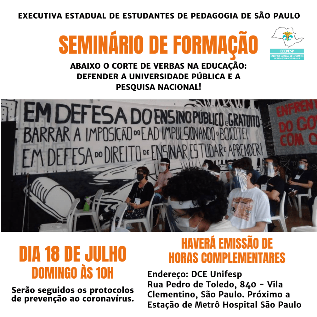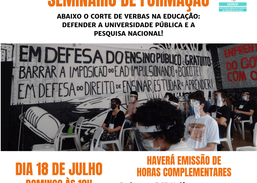 No próximo dia 18 de julho, domingo, será realizado o Seminário de Formação, que tem o tema: Contra o Corte de Verbas na Educação: defender a universidade pública e a pesquisa nacional.