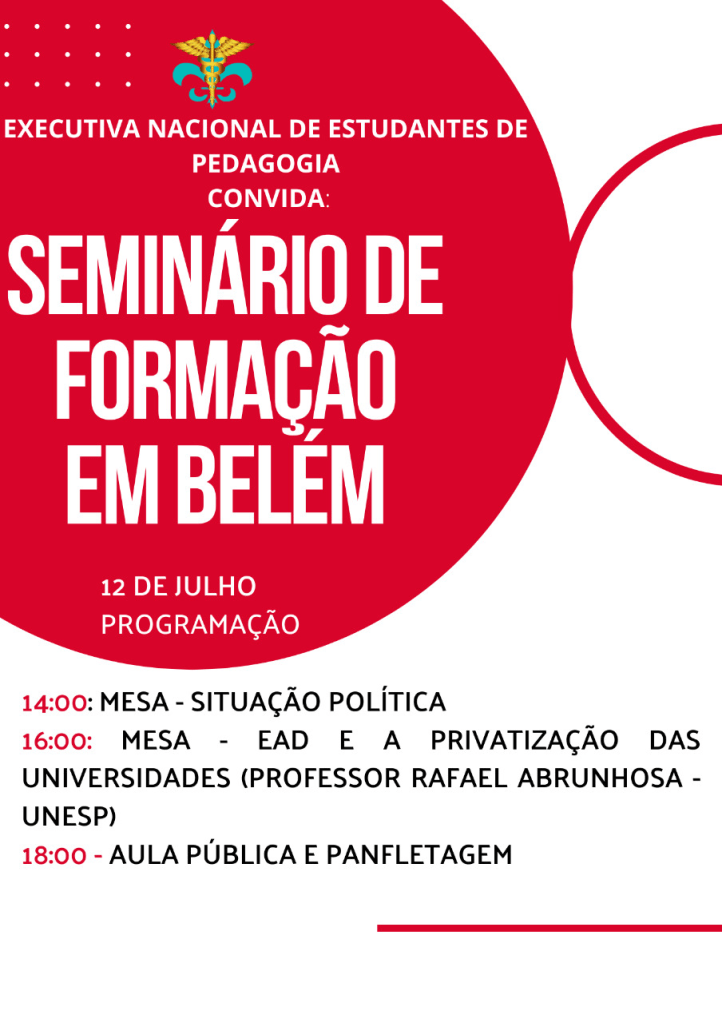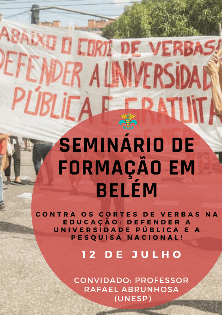 O Seminário ocorrerá em Belém no dia 12 de Julho, será presencial e com transmissão online via Youtube da palestra do Professor Rafael Abrunhosa (UNESP) com o tema: “EaD e a Privatização das Universidades Públicas”. Posteriormente ocorrerá uma aula pública e panfletagem. Confira a programação abaixo: