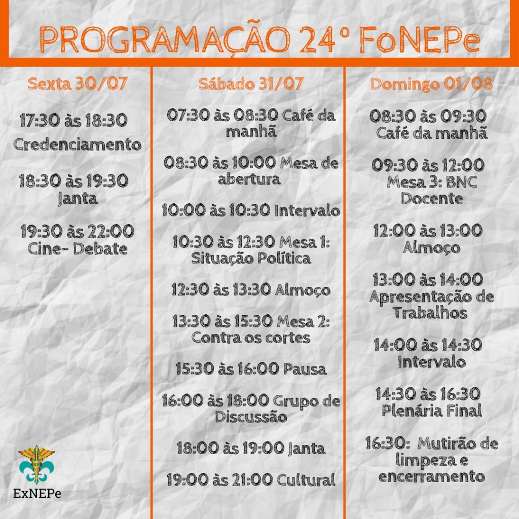 Confira abaixo a programação completa do 24º Fórum Nacional de Entidades de Pedagogia, que será realizado entre os dias 30 de julho e 1 de agosto, em Guarulhos, SP.