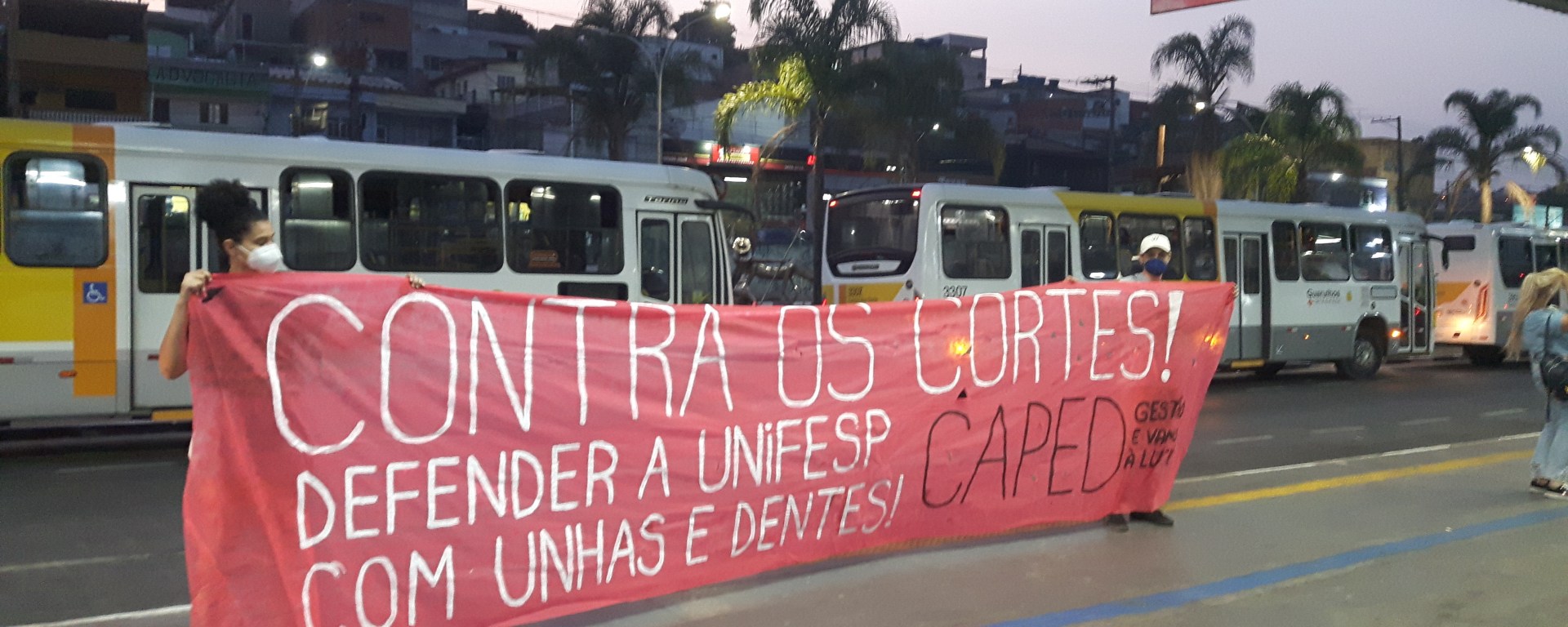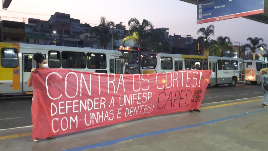 No última dia 25, quarta-feira, estudantes da Universidade Federal de São Paulo – UNIFESP, realizaram uma aula pública no terminal de ônibus Pimentas, em Guarulhos, próximo ao campus da universidade. Essa atividade foi organizada em conjunto pelos Centro Acadêmicos da Pedagogia, Letras, Ciências Sociais e História.