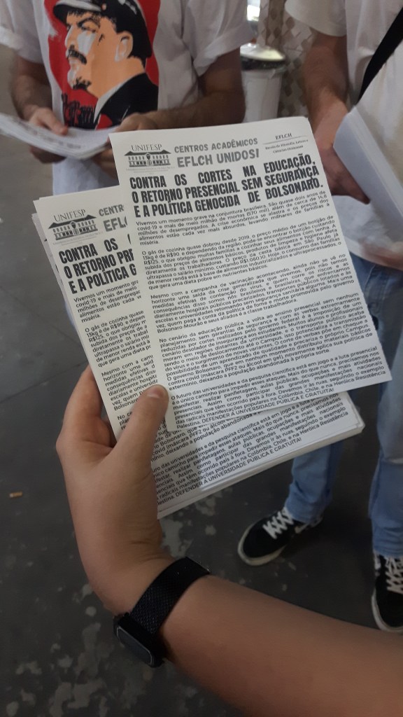 Além disso, a mobilização se deu motivada pela movimentação entorno do retorno presencial, pauta que foi levantada pela reitoria sem participação dos estudantes. A reitoria se pronunciou contrária ao retorno presencial, entretanto, perfidamente esconde que o motivo desse posicionamento é a grave crise orçamentária em que a instituição se encontra, situação causada pelo corte de verbas e que impede que haja garantia que a volta às atividades cumpra com as medidas sanitárias de prevenção ao coronavírus, bem como com o funcionamento do bandejão, assistência estudantil e outros pontos fundamentais para o funcionamento da universidade.