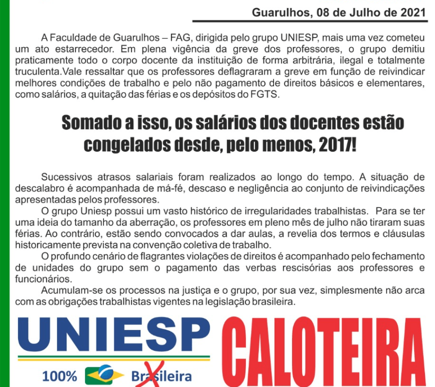 Repercutido de Universidade à Esquerda O grupo educacional União Nacional das Instituições de Ensino Superior Privadas (Uniesp) demitiu, no dia de ontem (7), professores que se encontravam em greve por conta de atraso de pagamentos de salário. Após quase um mês de greve, a Uniesp demitiu todos os professores e professoras grevistas da unidade de Guarulhos, como forma de retaliar e golpear a luta que … Continuar lendo Uniesp demite professores grevistas como forma de retaliação