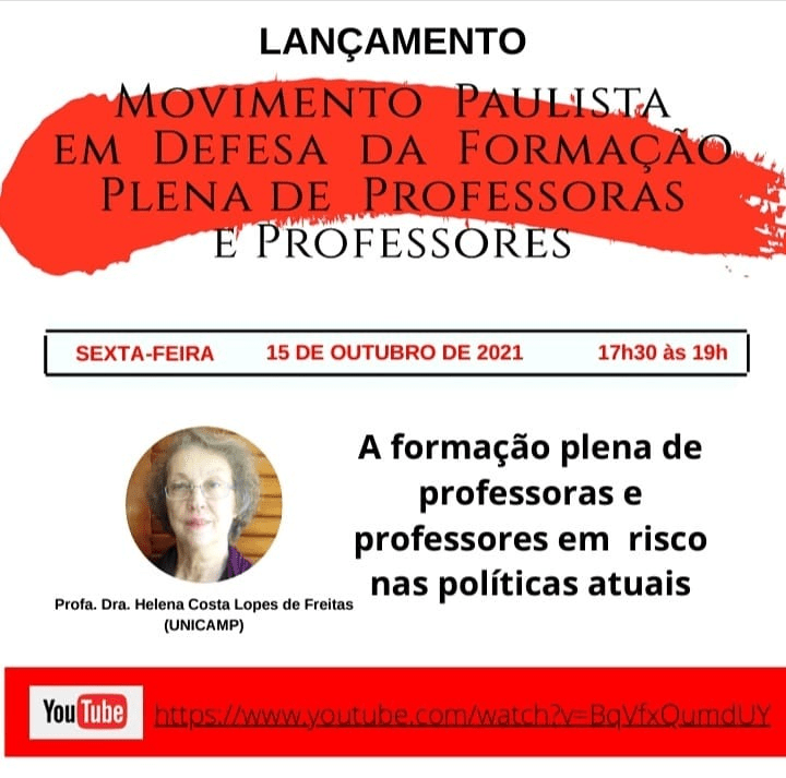 Teremos a exposição intitulada “A formação plena de professoras e professores em risco nas políticas atuais”, com a participação da Profa. Dra. Helena Costa Lopes de Freitas.