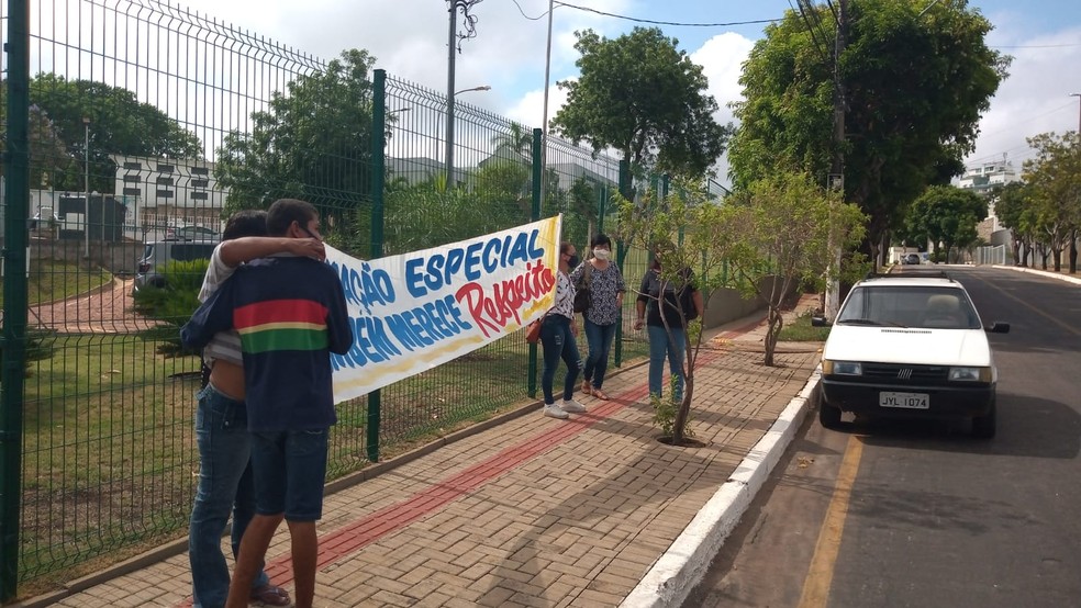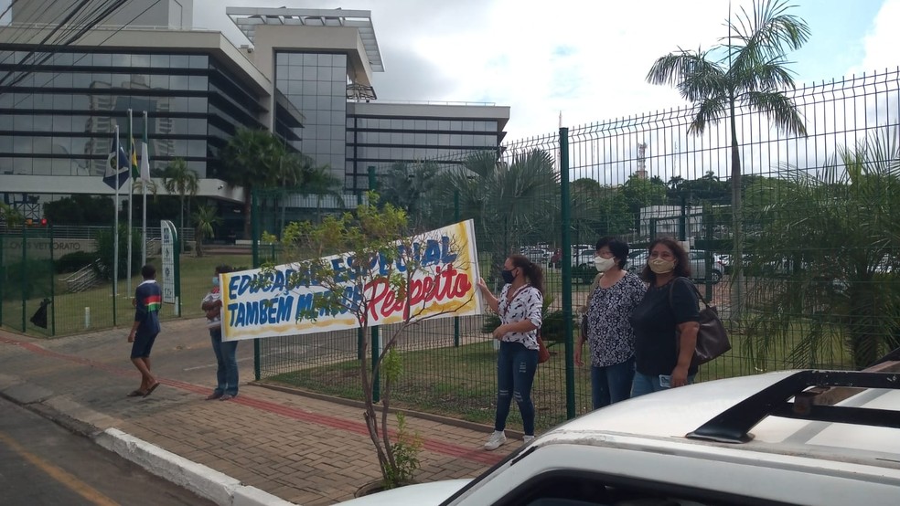 Um grupo de profissionais da educação realizaram um protesto em frente ao prédio da Secretaria Estadual de Educação (Seduc), em Cuiabá, nesta segunda-feira (25), para reivindicar melhores condições de trabalho nas escolas que atendem crianças e adolescentes especiais.