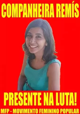 Há quase 4 anos, Remís foi covardemente assassinada por seu ex-namorado, Paulo César, que ocultou seu corpo por vários dias, impedindo que a família, os amigos e companheiros tivessem sequer o direito de vê-la na despedida. Durante todo o período, desde a busca por Remís até a audiência de custódia, o Estado brasileiro deixou claro seu caráter de classe. Inicialmente, tentando impedir a família de preencher o boletim de ocorrência informando seu desaparecimento, nas buscas por Remis, quase excluíram o assassino da lista de suspeitos, seu corpo foi encontrado pelo povo, mobilizado pela campanha iniciada por seus companheiros de luta, durante a audiência de custódia, policiais queriam impedir a entrada da advogada Drª Maria José do Amaral ao Fórum, onde a “justiça” pretendia liberar o assassino com uma fiança, o que foi revertido graças à manifestação contundente em frente ao Fórum.
