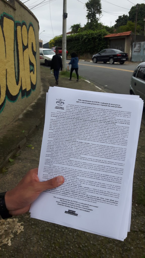 Atendendo ao chamado da Executiva Nacional de Estudantes de Pedagogia, na manhã do dia 21, studantes se reuniram na frente de escolas estaduais em Guarulhos, antes do início do Exame Nacional do Ensino Médio (ENEM), para distribuir panfletos da ExNEPe denunciando a realização do exame e exigindo seu cancelamento imediato.