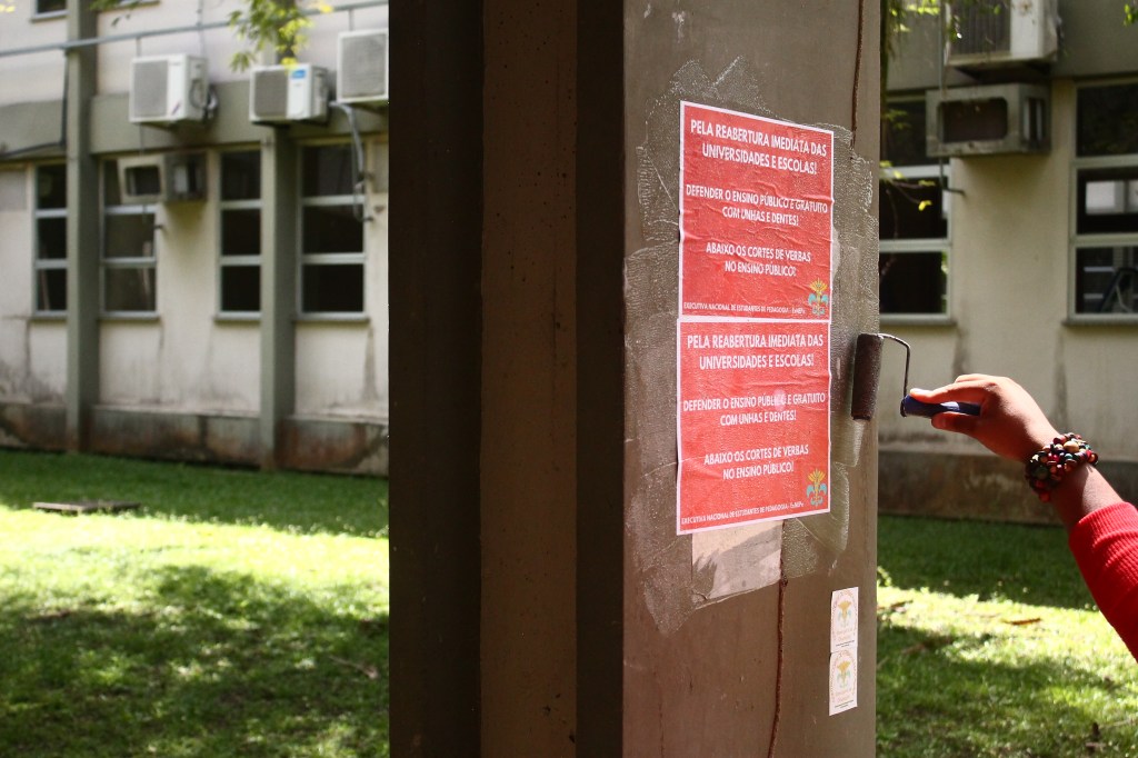 Após a aula pública os estudantes realizaram atividade de colagem de cartazes pelos corredores da universidade exigindo o imediato retorno às aulas presenciais e contra os cortes de verbas das universidades configurando uma vitoriosa atividade no Dia Nacional de Lutas da Pedagogia!
