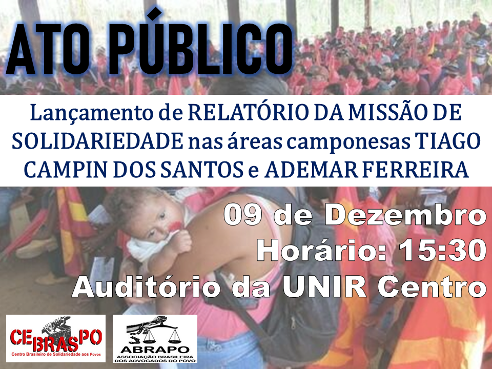 ATO PÚBLICO de lançamento do Relatório da Missão de Solidariedade nas áreas camponesas Tiago Campin dos Santos e Ademar Ferreira e outras denúncias recentes de violação de direitos dos camponeses e seus advogados (as). O Ato será realizado no dia 09 de dezembro de 2021 (quinta-feira) às 15:30 horas no auditório da UNIR-CENTRO (Av. Pres. Dutra, 2965, Centro, Porto Velho – RO).