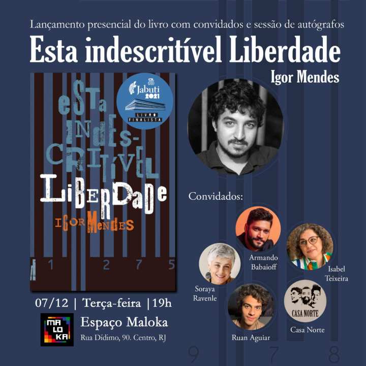 O livro “Esta Indescritível Liberdade”, do escritor e ativista Igor Mendes será lançado presencialmente pela primeira vez desde sua publicação. Recentemente, a obra foi indicada como finalista do prêmio Jabuti – maior premiação literária do país -, na categoria infanto-juvenil.