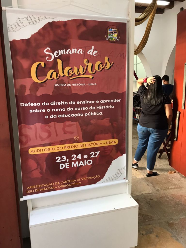 Dentre os dias 23, 24 e 27 de maio, estudantes do 2º período do curso de Licenciatura em História da Universidade Estadual do Maranhão (UEMA), realizaram uma vitoriosa semana de calouros com o tema: Defesa do direito de ensinar e aprender: sobre o rumo do curso de História e da educação pública. Evento que como definido pelos estudantes do curso desde a organização do mesmo, possui um caráter político, científico, cultural e acadêmico.