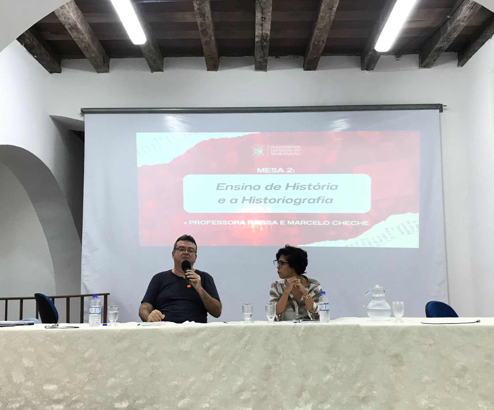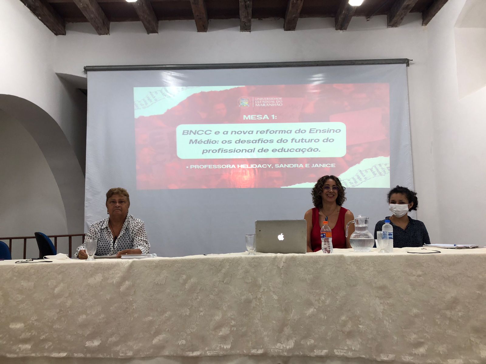Em sua primeira mesa de debate, o evento contou com o tema: A BNCC e a “nova” reforma do ensino médio: os desafios do futuro do profissional da educação, apresentadas pelas professoras Helidacy, Sandra e a discente Janice, seguida pela mesa de tema Ensino de História e a Historiografia, apresentadas pela professora Raissa e pelo professor Marcelo Cheche.