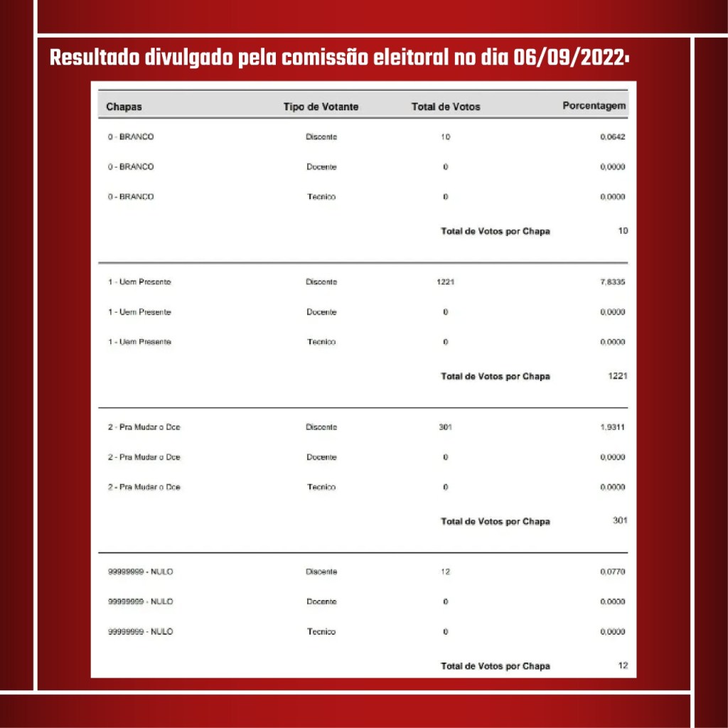 No dia 06 de setembro foi anunciado o resultado das eleições para o Diretório Central dos Estudantes (DCE) da Universidade Estadual de Maringá (UEM): 1221 votos para a Chapa 1, contra 301 votos para a chapa 2! (https://www.instagram.com/p/CiNpxZYLxBK/)