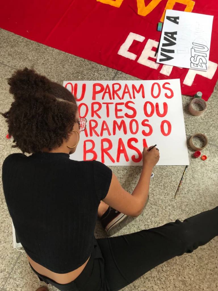 Levantando as bandeiras da linha classista, independente e combativa da ExNEPe, os estudantes puxaram o grito “Independência, classismo e combatividade a história avança com luta de verdade!”. Logo após, iniciou o momento de confecção de cartazes onde todos puderam colocar de forma criativa, consciente e coletiva a sua indignação no papel.