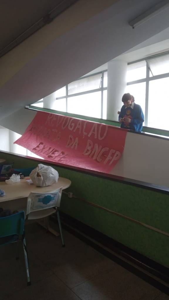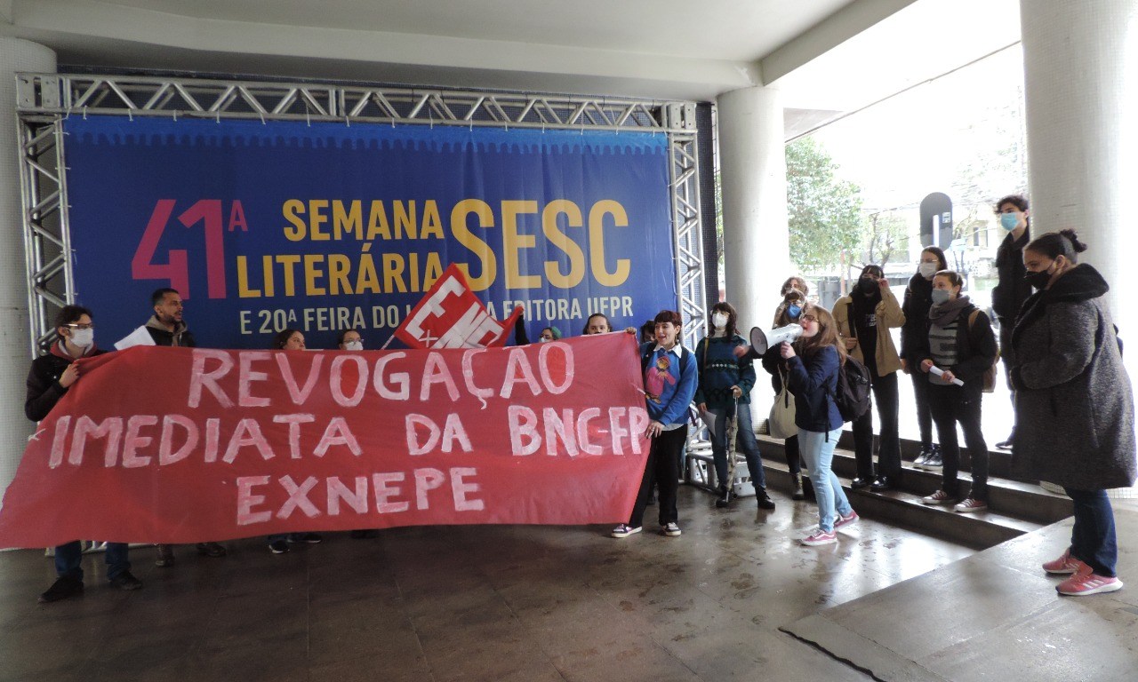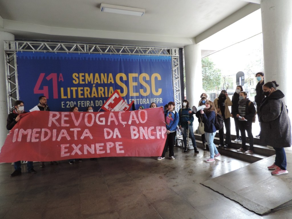Foram puxadas palavras de ordem como “Abaixo, abaixo, abaixo a BNC, pelo direito de estudar e aprender” “Sou pedagogo, sou cientista, e não aceito o caminho imobilista” ” Avante, avante, avante juventude, a luta é o que muda, o resto só ilude”. Os estudantes desceram as rampas do prédio entoando essas palavras de ordem até o térreo, com faixa e bandeira da ExNEPe.
