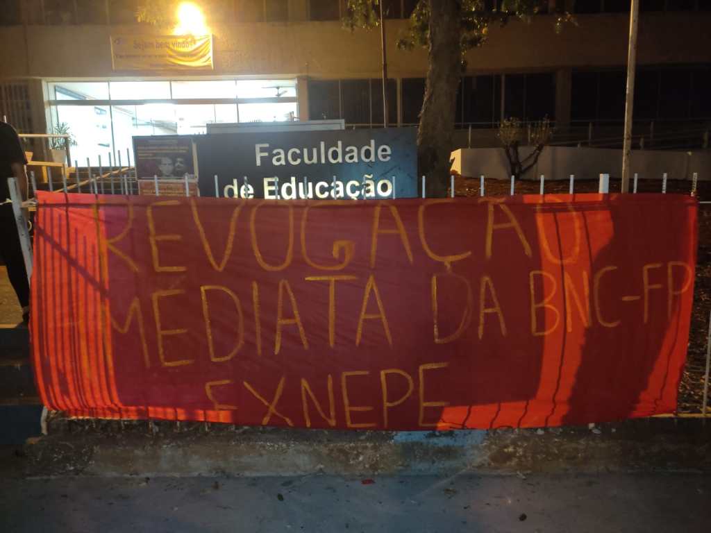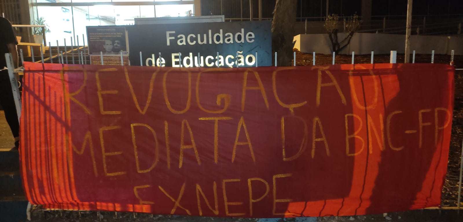 Os estudantes se concentraram com faixa no pátio do prédio da pedagogia. Fizeram passagem em sala entregando nota oficial da Executiva e deixando o convite aos estudantes para conhecerem o plano de lutas. Ao final a faixa foi fixada na entrada do prédio para deixar uma contundente mensagem pela imediata revogação da resolução 02/2019.