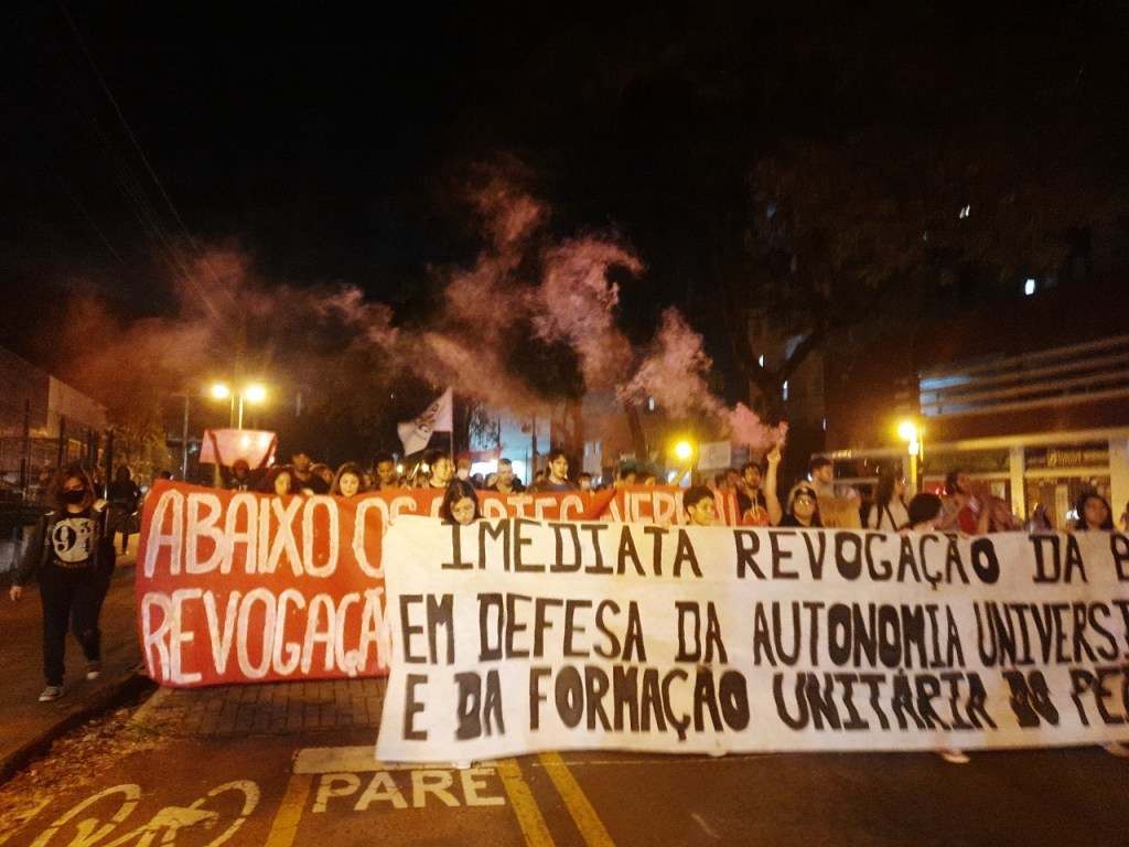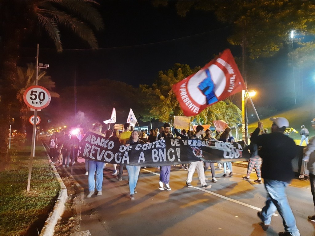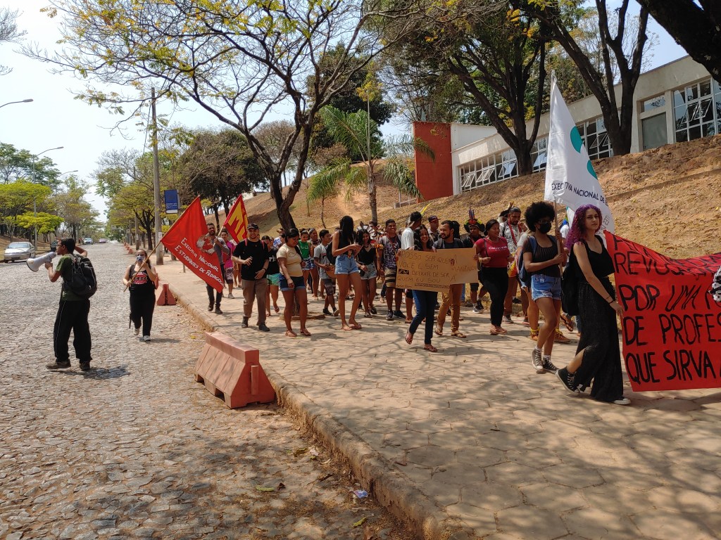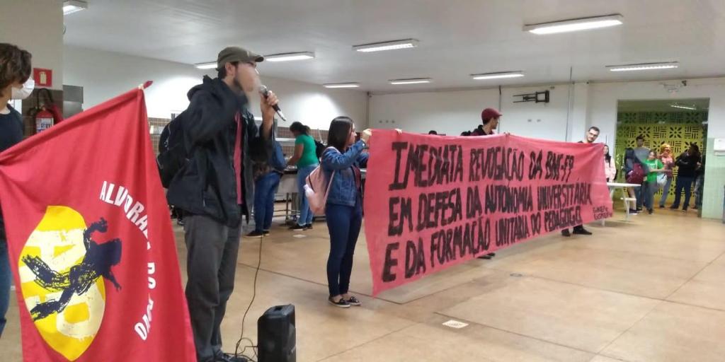 “[…] estudantes do curso de pedagogia, do curso de Formação Intercultural para Educadores Indígenas (FIEI) e de outras licenciaturas da UFMG promoveram uma grandiosa manifestação exigindo imediata revogação da Resolução 02/2019 (BNC Formação), bem como protestaram contra o corte de verbas nas universidades públicas, contra o sucateamento na UFMG e a falta de cantina nos prédios, as reformas curriculares no ensino básico (BNCC e “Novo” Ensino Médio), os graves cortes na ciência e na permanência estudantil, e contra o genocídio dos povos indígenas e exigência de demarcação de suas terras.”