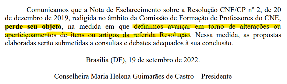 No dia 19 de setembro de 2022, apenas 4 dias após as contundentes mobilizações do dia 15/09 – Dia Nacional de Combate à BNC – Formação, convocado pela ExNEPe, o Conselho Nacional de Educação (CNE) publicou um comunicado determinando que: “a Nota de Esclarecimento sobre a Resolução CNE/CP nº 2, de 20 de dezembro de 2019, redigida no âmbito da Comissão de Formação de Professores do CNE, perde seu objeto“. O objeto da famigerada Nota Técnica nada mais é que a própria Resolução 02/2019, que impõem a Base Nacional Comum de Formação de Professores (BNC-FP). O comunicado continua: “na medida em que definimos avançar em torno de alterações ou aperfeiçoamentos de itens ou artigos da referida Resolução. Nessa medida, as propostas elaboradas serão submetidas a consultas e debates adequados à sua conclusão”.