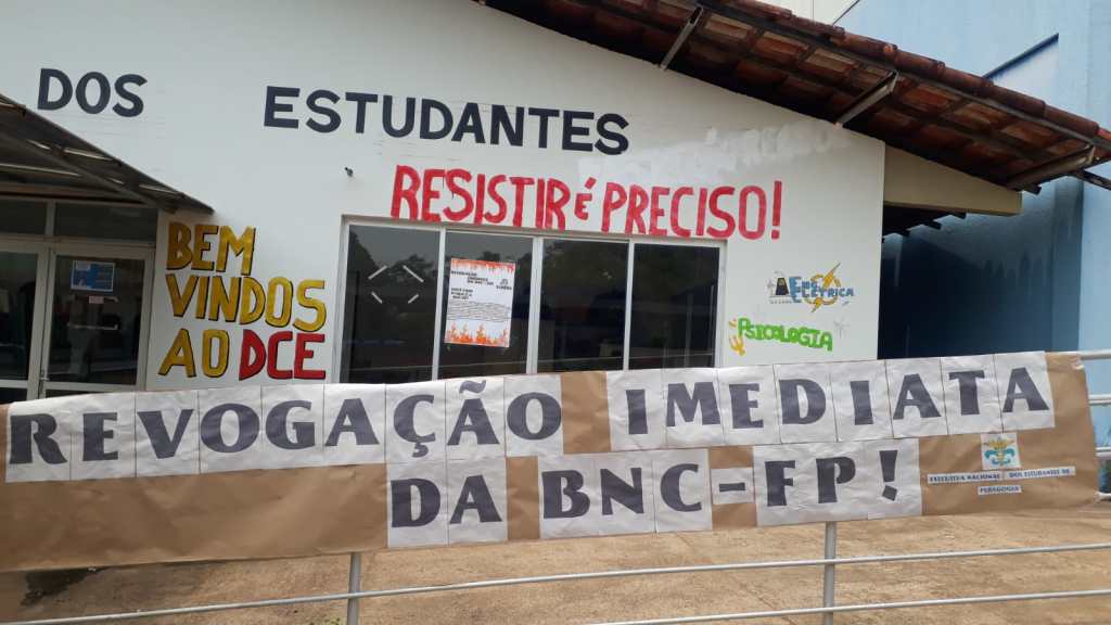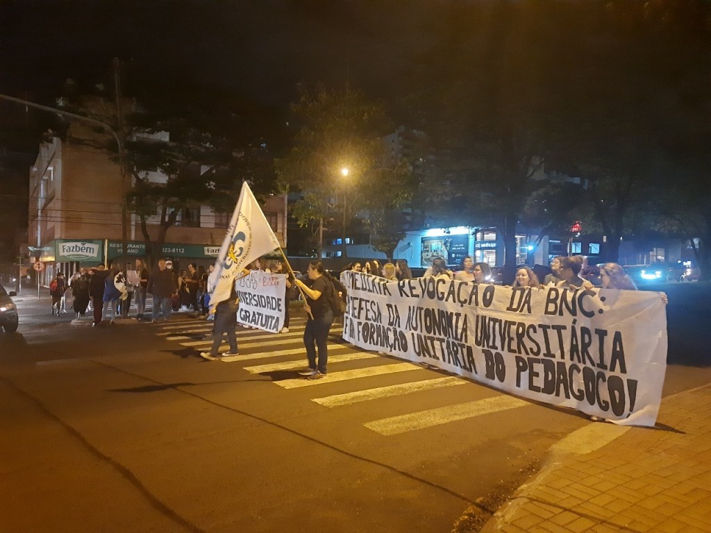 No Mato Grosso do Sul, na Universidade Federeal da Grande Dourados (UFGD), dezenas de estudantes de pedagogia e licenciatura também construíram uma vigorosa manifestação: “O ato teve início no RU da universidade, local de maior movimentação no período da noite. Os estudantes adentraram de forma combativa levantando uma grande faixa exigindo a revogação imediata da BNC-FP e puxando palavras de ordem. “ […] “Os estudantes então saíram em marcha pelo campus prosseguindo a agitação até chegar ao prédio da Faculdade de Educação. Lá se juntaram ao restante dos estudantes de pedagogia e professores que estavam esperando, chegando a mais de 50 pessoas”. A ação combativa também contou com a presença do coordenador do curso de pedagogia e da diretora da faculdade de educação.
